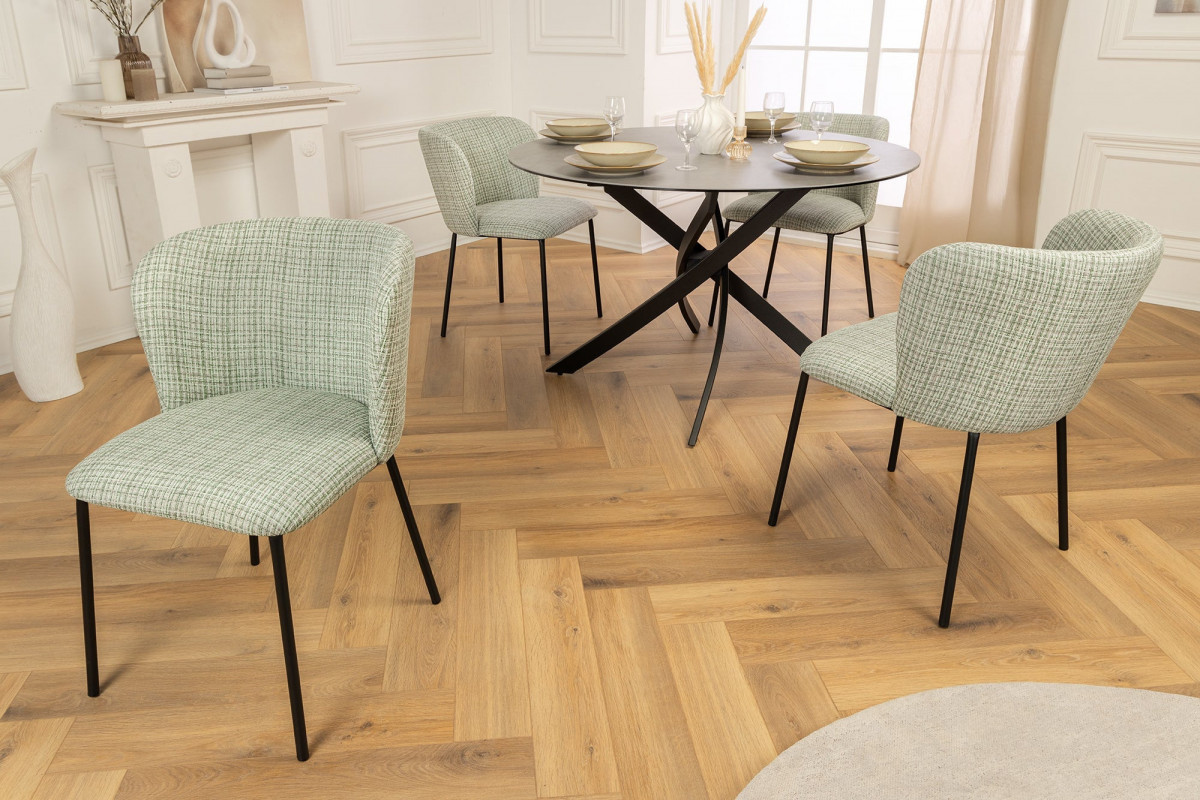 Élégante et unique\xa0: chaise rétro au motif à carreaux vert et rose saisissantAvec cette chaise en tissu bouclé de haute qualité, vous attirerez tous les regards dans votre intérieur. La surface texturée du revêtement bouclé offre une assise confortable et confère à la chaise une sensation unique. La structure en métal noir offre la stabilité nécessaire et une touche moderne, tandis que le dossier ergonomique offre un confort optimal. Ajoutez une touche de couleur à votre intérieur avec cette chaise design au motif à carreaux vert et rose intemporel\xa0!Confort d'assise maximal avec la chaise bouclée pour votre salle à mangerQue ce soit dans la salle à manger, le salon ou la cuisine\xa0: les chaises LYON sont toujours un ajout particulièrement élégant à votre ambiance\xa0! Notre conseil\xa0: Associez votre chaise à d'autres meubles au style rétro. Les tables aux pieds noirs sont particulièrement adaptées, car elles s'harmonisent parfaitement avec le design de la chaise. Créez une ambiance harmonieu