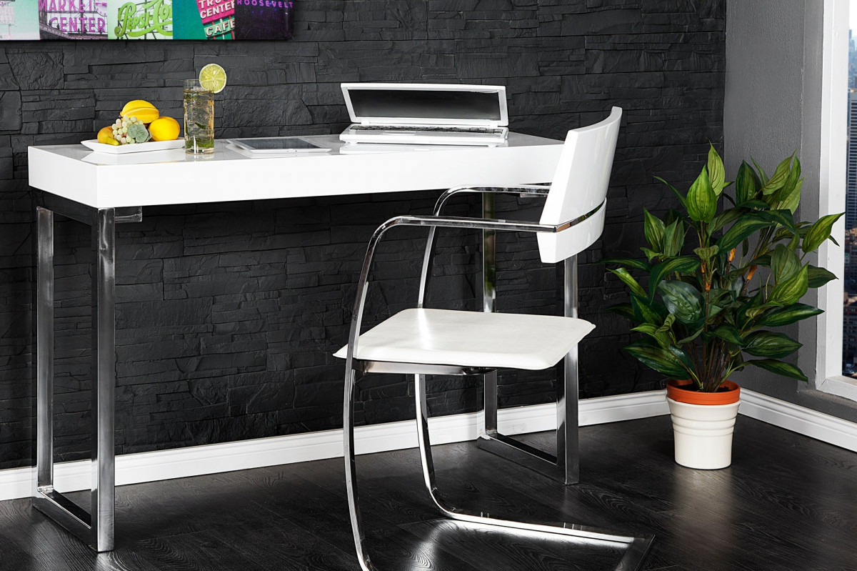 Un bureau moderne avec une finition brillanteDe nos jours, un bureau est bien plus qu'un simple meuble fonctionnel sur le lieu de travail. Notre bureau WHITE DESK se présente comme un ensemble harmonieux. Il impressionne par son plateau de travail blanc épuré et épuré, en parfaite harmonie avec un cadre chromé haut de gamme. Une linéarité traverse toute la table, qui, sans effets apparents, ne nuit pas à l'efficacité du travail. La finition blanche brillante tendance s'intègre parfaitement à toutes les ambiances et constitue un plan de travail idéal.Cette table séduit par sa polyvalenceCette table vous offre la base idéale pour un travail clair et efficace. Grâce à sa polyvalence, elle fait également office de secrétaire, de coiffeuse ou de table de toilette. Combinez ce chef-d'\x9cuvre contemporain avec notre mobilier de bureau exclusif et créez votre espace de travail idéal. Trouvez le siège idéal parmi notre vaste sélection. Découvrez les magnifiques objets décoratifs uniques de Riess-