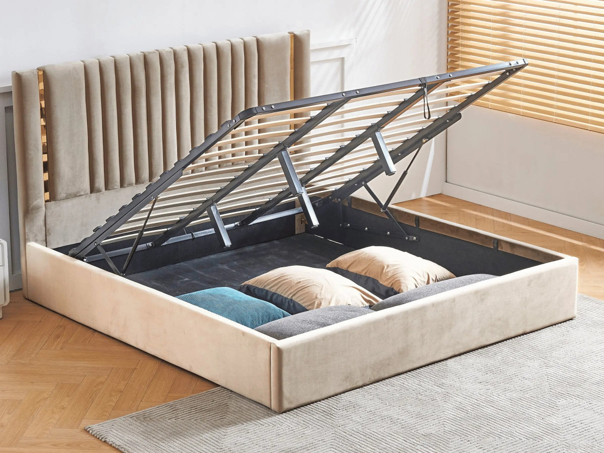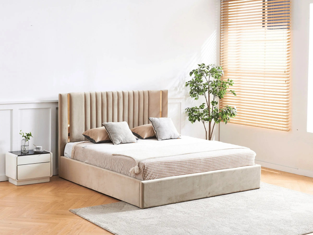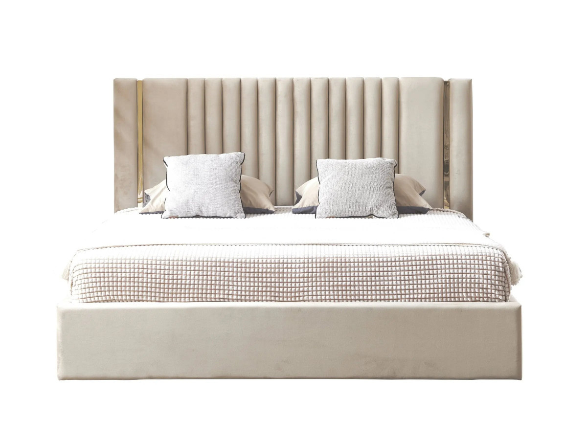 Lit coffre tête de lit effet métal Or - MANON - Velours beige / 140x190 cm
