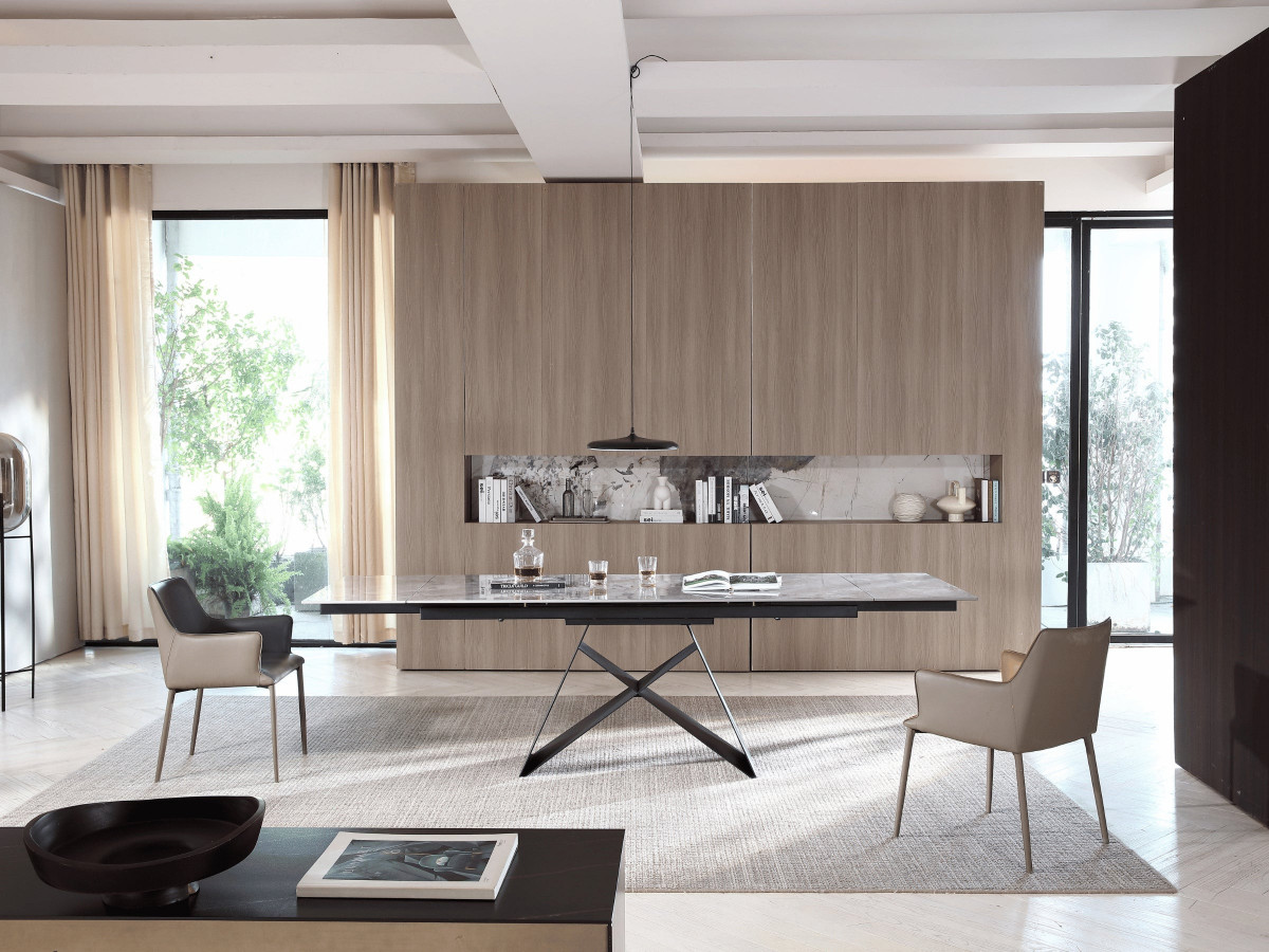 Donnez une touche d\\'élégance à votre salle à manger avec notre table Masdar en céramique extensible.Choisissez parmi plusieurs tailles et couleurs pour un agencement personnalisé.Les pieds design futuristes attirent l\\'attention tandis que l\\'effet marbre haut de gamme ajoute une touche de luxe.Dimensions 160 cm x 90 cm x 76 cm, avec la possibilité de s\\'étendre jusqu'à 220 cm.