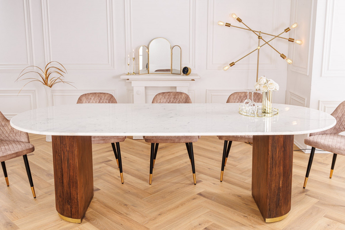 Table à manger élégante au design vintageVous aimez les designs extravagants et recherchez la table idéale\xa0? Notre table à manger GATSBY est faite pour vous\xa0! Son élégant plateau en marbre blanc est le point fort de cette table en bois massif. La surface rainurée de ses pieds est un atout visuel et tactile. Grâce au bois de manguier massif et au plateau en marbre véritable, la table offre une base stable. Les veinures uniques de son bois font de cette table de salle à manger une pièce unique dans votre intérieur. Découvrez l'extravagante table à manger GATSBY chez vous\xa0!Matériaux solides et finition de haute qualitéLes pieds en métal doré forment un contraste saisissant avec le plateau ovale massif. La table à manger, mesurant 240 x 100 cm, devient la pièce maîtresse de votre salle à manger, créant une atmosphère chaleureuse pour les repas partagés et les réunions conviviales. Notre conseil déco\xa0: Associez la grande table à manger à d\x92autres meubles au design rétro et créez une ambianc